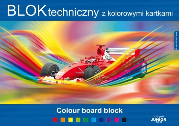 • Blok techniczny kolorowy 10 kartek wysokiej jakości karton barwiony w masie o gramaturze 170 g/m2 -okładka kredowa z połyskiem o gramaturze 115 g/m