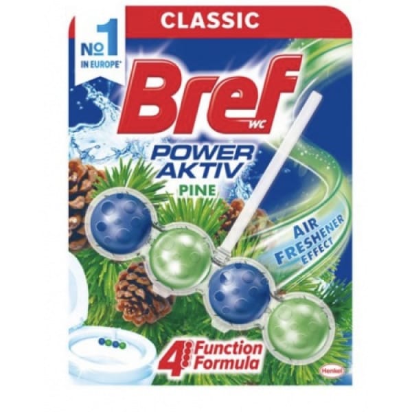 Bref Power Active zapach LASU SOSNOWEGO ma fantastyczną nową formułę z czterema funkcjami, która obejmuje higienę, mocną pianę, moc przeciwdziałającą osadzaniu się kamienia i wyjątkową świeżość, łącząc stałą higieniczną czystość toalety i fantastyczny zapach sosnowego lasu, który utrzymuje się przez tygodnie.