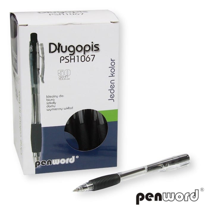 Długopis automatyczny z wymiennym wkładem, obudowa zaprojektowana specjalnie pod kątem ergonomii, gumowy uchwyt gwarantujący komfort pisania, transparentna obudowa pozwalająca kontrolować stopień zużycia tuszu, klips w kolorze tuszu, tusz wodoodporny.