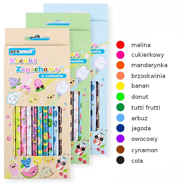 Zestaw zawiera 12 kredek zapachowych, dzięki którym dziecko narysuje, co tylko zechce. Kredki wyróżniają się intensywnymi kolorami i są wygodne w trzymaniu. Opakowanie zawiera 12 różnych zapachów m.in.: malina, cukierkowy, mandarynka, brzoskwinia, banan, donut, tutti frutti, arbuz, jagoda, owocowy, cynamon, cola.