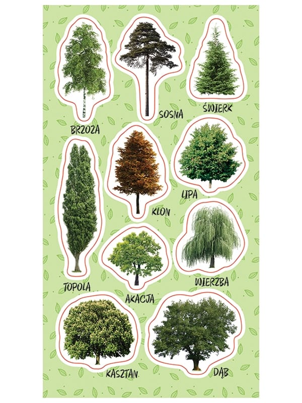 Zestaw naklejek do ozdoby zeszytów, albumów, listów, pocztówek … 10 drzewek z opisami. POLECANE DO SZKÓŁ