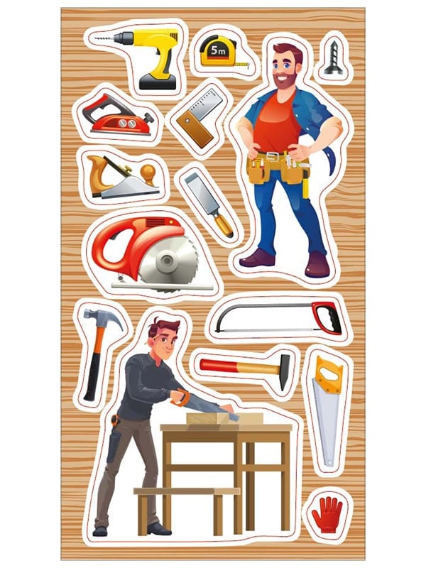 Zestaw naklejek do ozdoby zeszytów, albumów, listów, pocztówek … 15 naklejek związanych z pracą stolarza. POLECANE DO SZKÓŁ