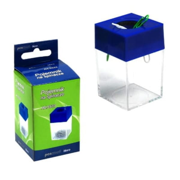 Pojemnik na spinacze z magnesem,wykonany z tworzywa sztucznego, posiada magnes, który ułatwia przechowywanie spinaczy, zapakowany w kartonik.