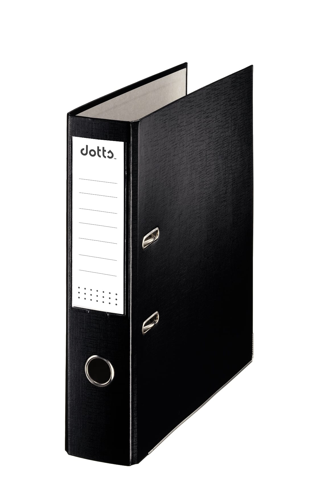 Format A4, z mechanizmem dźwigniowym, wykonane z twardej tektury pokrytej folią polipropylenową, wzmocniony otwór na palec, dolna krawędź wzmocniona metalowym okuciem, dwustronna etykieta wymienna.