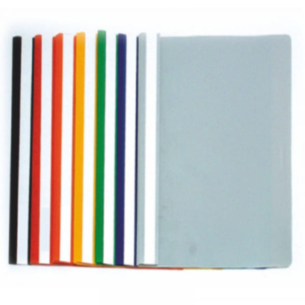 Wykonany z najwyższej jakości folii twardej PCV z praktycznymi wąsami i listewką dociskową. Wzdłuż krawędzi umieszczony papierowy pasek do opisu zawartości. Przednia okładka przezroczysta twarda, tylna kolorowa.