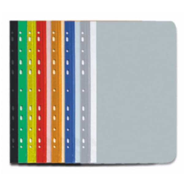 Wykonany z miękkiego polipropylenu; przednia okładka przezroczysta, tylna kolorowa; wewnątrz klasyczny mechanizm z wąsem i listwą skutecznie zabezpieczający wpiętą zawartość; na bocznej krawędzi wysuwany pasek do opisu zawartości.