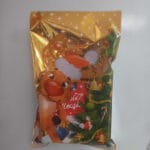 Torebki foliowe prezentowe świąteczne. Folia wewnętrzna jest w kolorze złotym, natomiast folia zewnętrzna to folia ze świątecznym nadrukiem. Torebki sprzedawane są w opakowanich zbiorczych po 25 sztuk. W opakowaniu jest mix wzorów świątecznych.