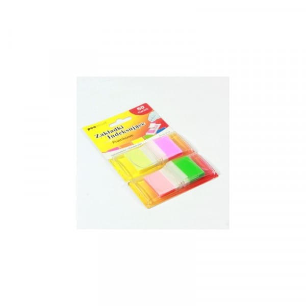 Zestaw zakładek indeksujących – 50 karteczek, 2 sztuki 25×45 mm . Karteczki występują w różnych kształtach i kolorach.