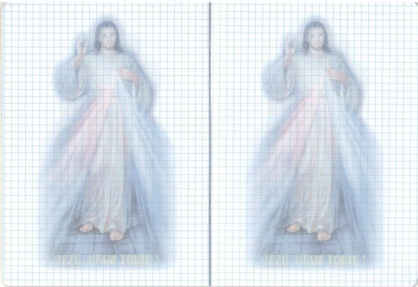 Zeszyt do religii 60 kartek w kratkę niebieską bez marginesu z poddrukiem na kartkach, format A5. Zeszyty wydawane losowo.